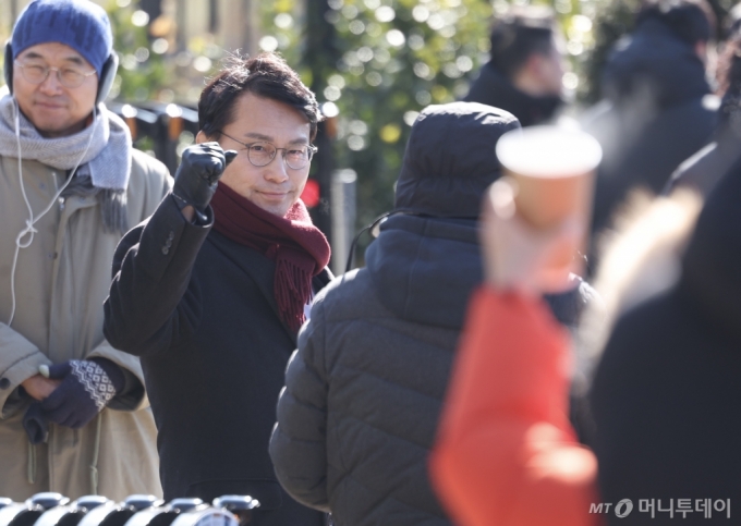 [서울=뉴시스] 김명년 기자 = 윤상현 국민의힘 의원이 10일 오전 서울 용산구 한남동 대통령 관저 앞에서 시민에게 주먹을 들어보이고 있다. 2025.01.10. kmn@newsis.com /사진=김명년 |