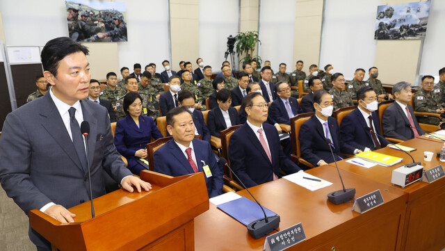 김성훈 경호차장이 22일 오전 국회에서 열린 ‘윤석열 정부의 비상계엄 선포를 통한 내란 혐의 진상규명 국정조사 특별위원회’ 1차 청문회에서 의원들의 질문에 답변하고 있다. 윤운식 선임기자 yws@hani.co.kr |