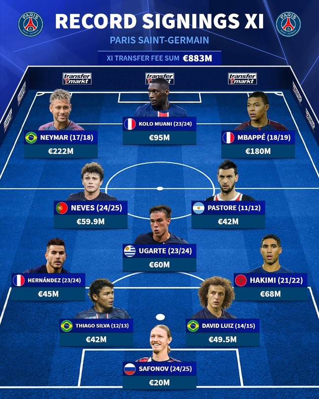 축구 통계 매체 '트랜스퍼마크트'는 23일(이하 한국시간) 공식 SNS를 통해 PSG 역대 최고 이적료 영입 베스트11을 공개했다.