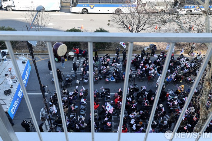 [서울=뉴스핌] 사진공동취재단 = 윤석열 대통령 탄핵심판 4차 변론기일인 23일 오후 서울 종로구 헌법재판소 인근에서 윤 대통령 지지자들이 모여 탄핵무효 구호를 외치고 있다. 2025.01.23 photo@newspim.com