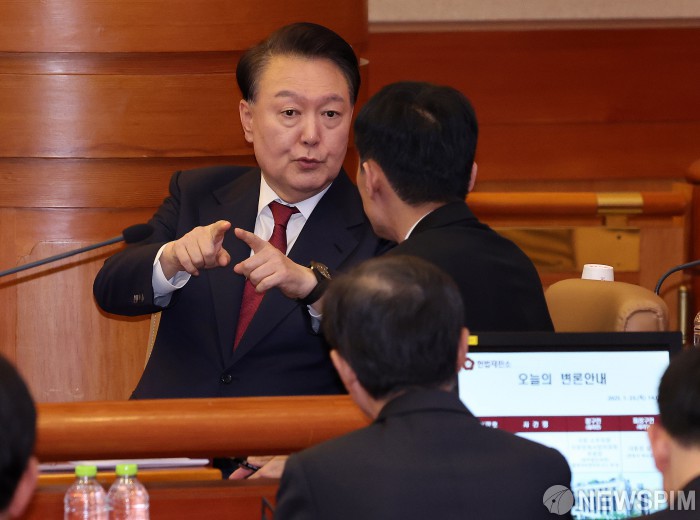 [서울=뉴스핌] 사진공동취재단 = 윤석열 대통령이 23일 서울 종로구 헌법재판소에서 열린 탄핵심판 4차 변론에 출석해 변호인단과 대화를 나누고 있다. 2025.01.23 photo@newspim.com