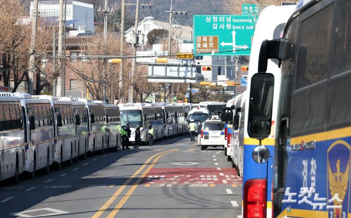 윤석열 대통령에 대한 탄핵심판 4차 변론이 열린 23일 오후 서울 종로구 헌법재판소 인근 도로에 차량통행이 제한되고 있다. 2025.01.23 사진공동취재단