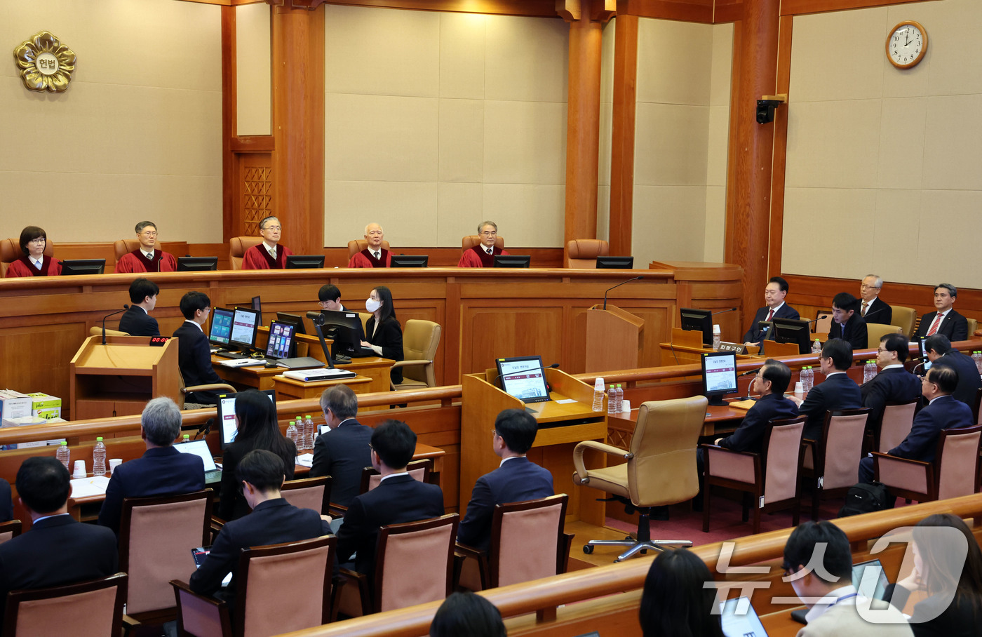 (서울=뉴스1) 사진공동취재단 = 23일 오후 서울 종로구 헌법재판소 대심판정에서 윤석열 대통령 탄핵심판 4차 변론기일이 진행되고 있다. 2025.1.23/뉴스1