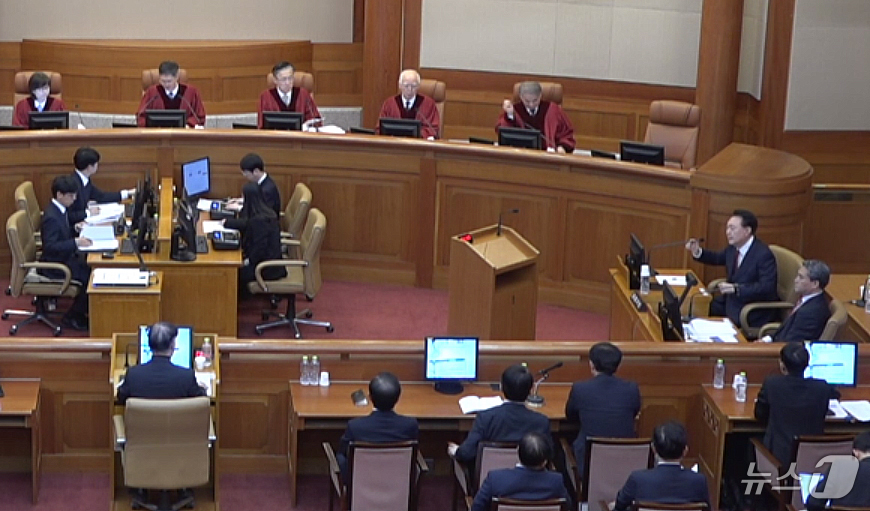 (서울=뉴스1) = 윤석열 대통령이 23일 오후 서울 종로구 헌법재판소에서 열린 윤석열 대통령 탄핵심판 4차변론에서 증인으로 출석한 김용현 전 국방부 장관(왼쪽)에게 증인신문을 하고 있다. (헌법재판소 제공) 2025.1.23/뉴스1