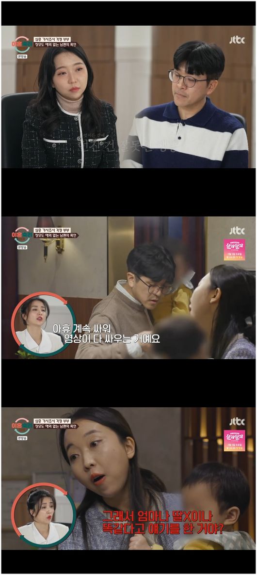 황진주는 “폭언이나 가정 폭력이 심각하다”라면서 “남편 욕설 때문에 정신과를 다녔다”라고 말했다. 또한 육아를 돕는 황진주의 어머니, 즉 조승환의 장모는 식탁을 어질러 놨는데 그에 대해 조승환은 막말을 했다는 것. 황진주는 “그래서 ‘어미나 딸x이나’라고 한 거냐”라고 말했고, 조승환은 덤덤하게 “그래, 내가 말했다”라고 말해 모두를 놀라게 했다.