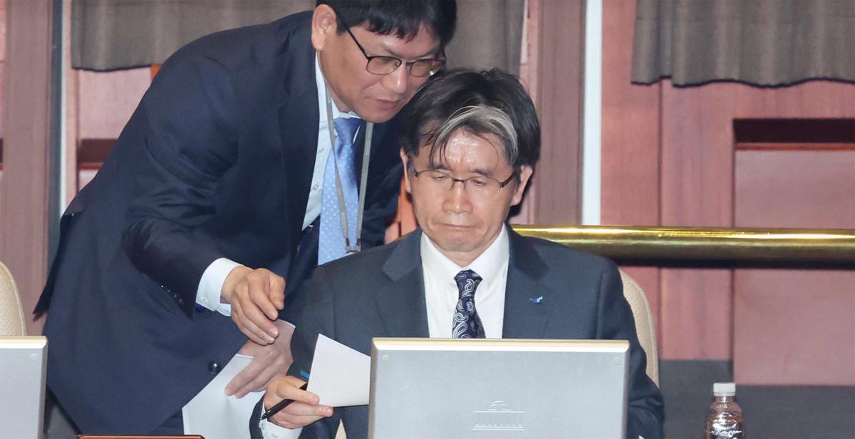 23일 국회에서 열린 서울서부지법 난입사태 관련 긴급현안질의에 참석한 오동운 고위공직자범죄수사처장이 공수처 관계자의 보고를 받고 있다. 뉴시스 |