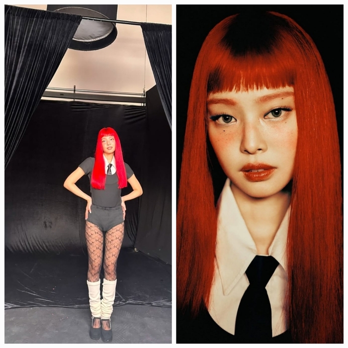 사진 속 제니는 직각 어깨를 강조한 실루엣과 시스루 망사 스타킹, 레그 워머로 개성 넘치는 룩을 완성했다. 특히, 긴 생머리에 강렬한 레드 컬러를 입힌 헤어스타일은 그녀만의 시그니처 무드와 실험적 감각을 드러냈다.