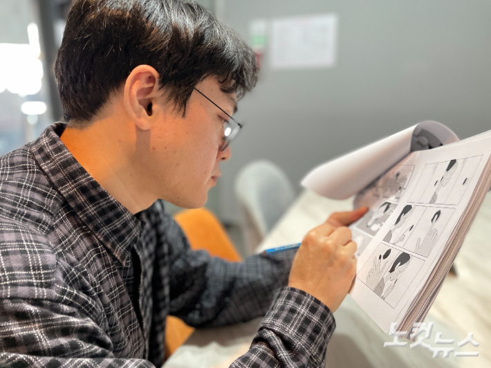 알라딘 콘텐츠 플랫폼 투비컨티뉴드 연재 웹툰 '오늘의 시네마' 정원 작가가 작품 원고를 살펴보고 있다. 김민수 기자 |