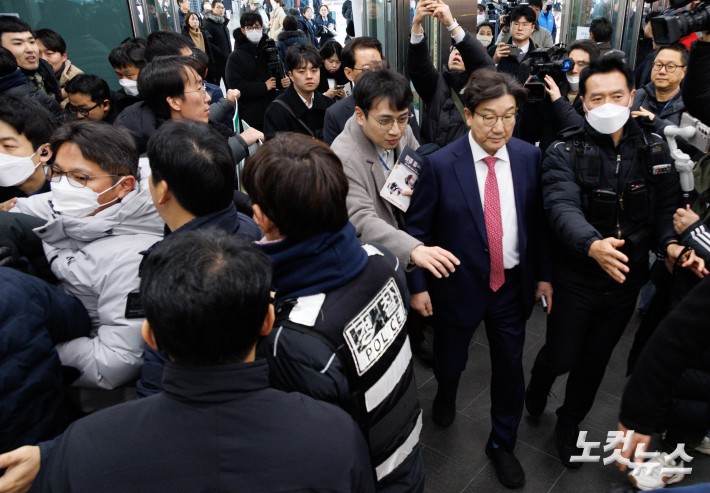 국민의힘 권성동 원내대표가 24일 오전 서울역에서 시민들에게 귀성인사를 하던 중 항의를 받고 있다