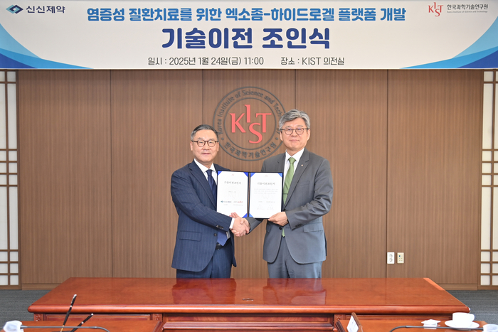 한국과학기술연구원(KIST)은 24일 서울 성북구 KIST 본원에서 신신제약과 염증성 질환 치료를 위한 엑소좀-하이드로겔 플랫폼 기술이전 조인식을 개최했다고 밝혔다.