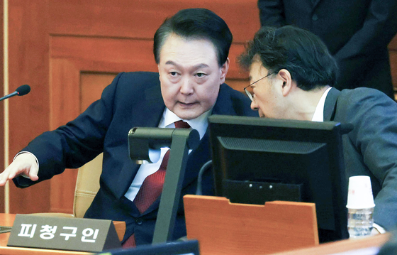 윤석열 대통령이 지난 21일 서울 종로구 헌법재판소에서 열린 윤석열 대통령 탄핵심판 3차 변론기일에서 차기환 변호사와 대화하고 있다. 전민규 기자 |