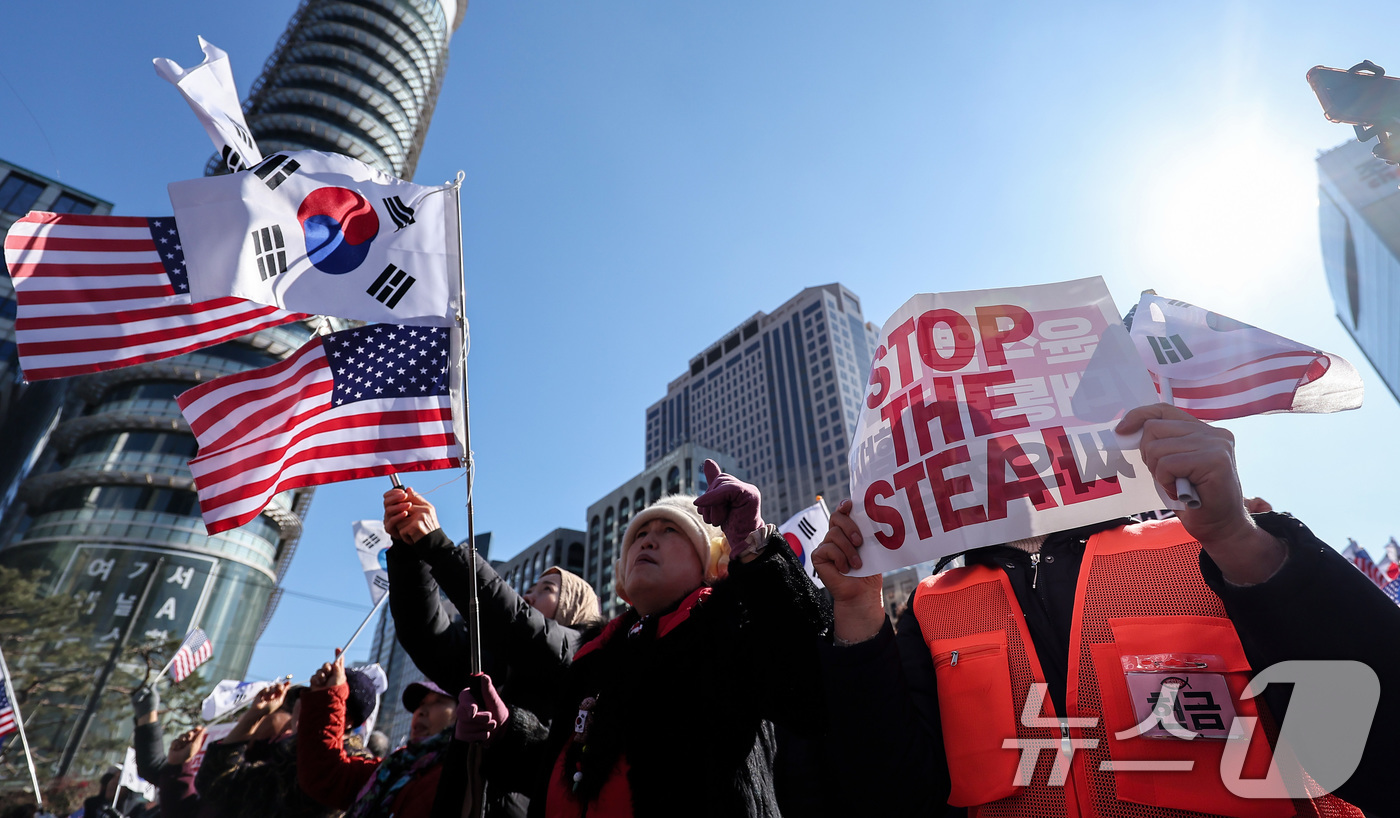 (서울=뉴스1) 김성진 기자 = 25일 서울 종로구 동화면세점 일대에서 대한민국바로세우기운동본부 주최로 열린 윤석열 대통령 탄핵 반대 집회에서 지지자들이 손피켓을 들고 구호를 외치고 있다. 2025.1.25/뉴스1
