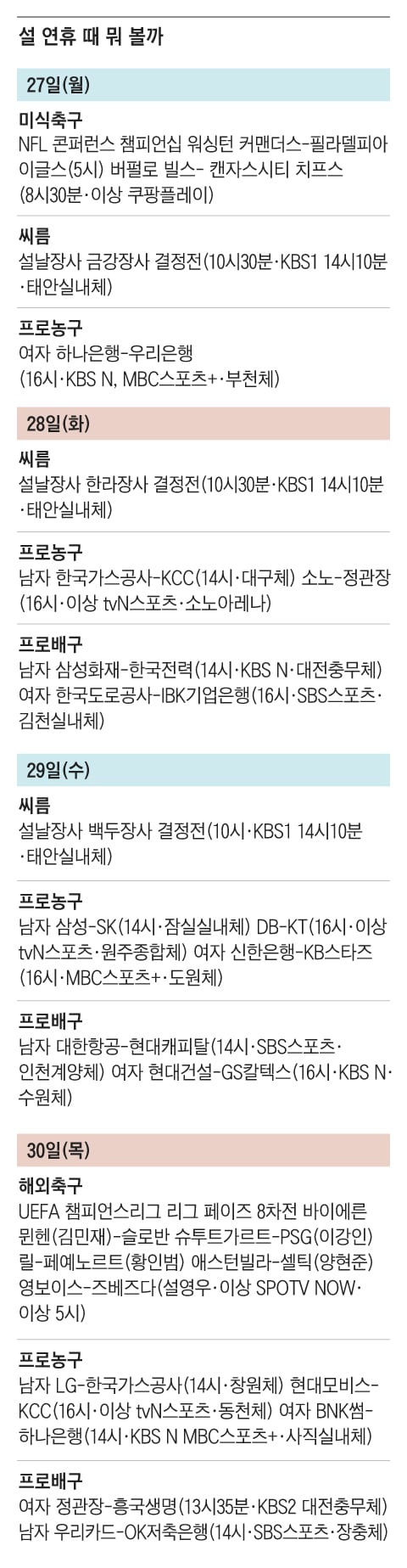 겨울 실내 스포츠 프로배구와 프로농구는 숨 가쁜 순위 경쟁을 이어간다. 프로배구 V리그에선 29일 남자부 1·2위인 현대캐피탈과 대한항공이 맞붙고, 30일엔 여자부 1·3위를 달리는 흥국생명과 정관장이 격돌한다. 27~30일 남자농구는 6경기, 여자농구는 3경기가 펼쳐진다. 민속씨름도 설날 볼거리 중 하나. 27일 금강장사, 28일 한라장사, 29일 백두장사 결정전이 차례대로 펼쳐진다.