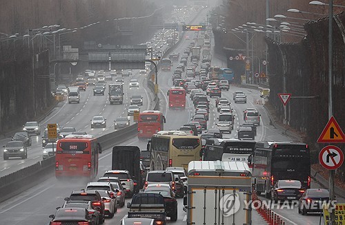 궂은 날씨 속 귀성차량 행렬 |