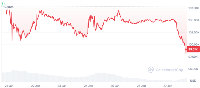 코인마켓캡에 따르면 27일 오후 5시 20분 기준 비트코인 가격은 전일보다 5.6% 하락한 9만9124.53 달러에 거래되고 있다. 이날 오후 4시30분께 10만 달러 선이 붕괴된 데 이어 한때 9만7000달러선까지 급락했다가 회복했다. 가상자산 시가총액 2위인 이더리움은 전일 대비 8%, 3위인 리플은 11%대의 하락률을 나타내고 있다.