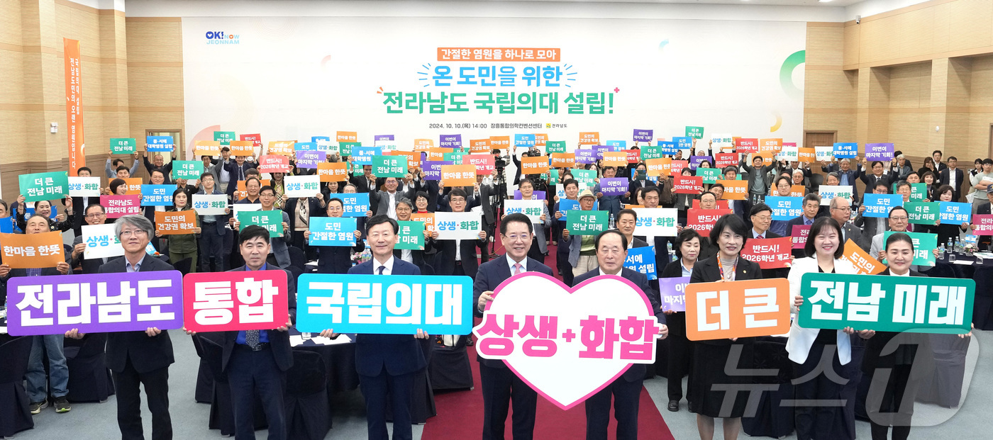 10일 장흥 통합의학컨벤션센터에서 열린 국립의대 설립방식 설명회에서 김영록 전라남도지사를 비롯한 주요 내빈들이 국립의대 설립을 염원하는 퍼포먼스를 하고 있다.(전남도 제공) 2024.10.10/뉴스1 |