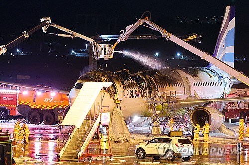 전날 김해공항에서 이륙을 준비하던 에어부산 BX391편에서 오후 10시 15분께 불이 나 1시간 16분 만인 11시 31분께 완전히 꺼졌다. 대피 과정에서 승객 3명이 타박상 등 경상을 입었다.