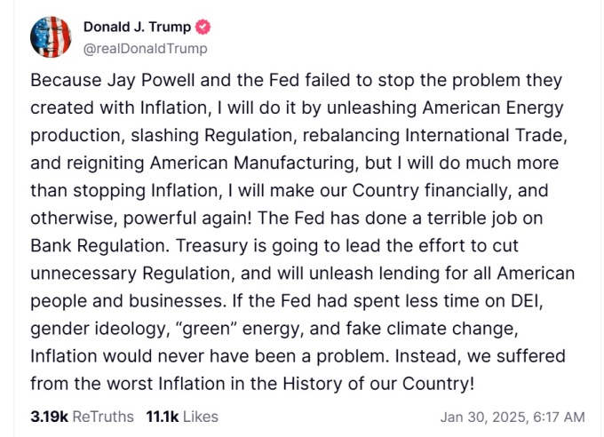FOMC 이후 트럼프 대통령이 트루스소셜에 올린 글 [사진=트럼프 트루스소셜 계정] 2025.01.30 kwonjiun@newspim.com |