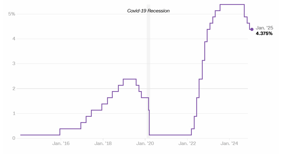 미국 기준금리 추이. 단위 연%. 1월 4.25~4.50%로 동결. 출처 CNN |