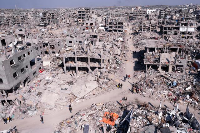 29일 가자지구 북부 자발리야에서 부서진 건물 및 잔해가 보이고 있다. 자발리야=AP 연합뉴스 |