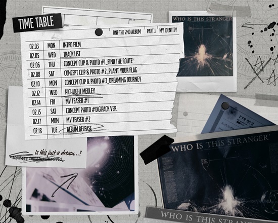 프로모션 일정과 더불어 타임테이블에는 앞서 공개된 커밍순 이미지에서와 같이 'Who Is This Stranger'라는 의문의 문구가 또 한 번 등장했다. 미스터리한 이미지 조각도 함께 담긴 가운데, 온앤오프의 새 앨범에 대한 궁금증을 증폭시킨다.