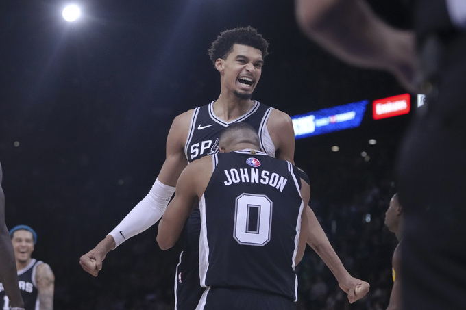 미국프로농구 샌안토니오 스퍼스의 빅토르 웸반야마가 득점을 올리고 동료와 기쁨을 나누고 있다. 사진=AP/뉴시스 |