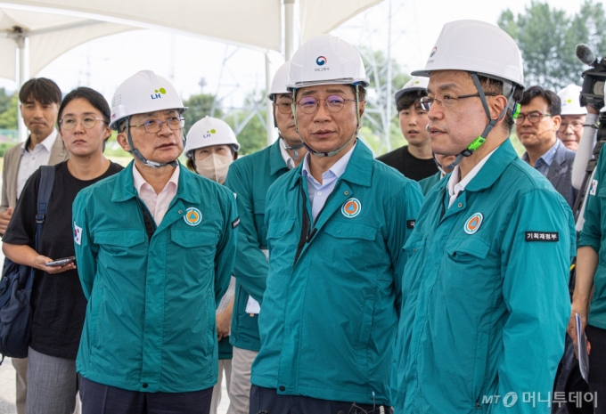 (부천=뉴스1) 이재명 기자 = 최상목 경제부총리 겸 기획재정부 장관(오른쪽부터)과 박상우 국토교통부 장관, 이한준 한국토지주택공사 사장이 20일 오후 경기도 부천시 오정구에 위치한 3기 신도시 부천대장지구 공사현장을 찾아 관계자로부터 설명을 듣고 있다. 2024.8.20/뉴스1 Copyright (C) 뉴스1. All rights reserved. 무단 전재 및 재배포, AI학습 이용 금지. /사진=(부천=뉴스1) 이재명 기자 |