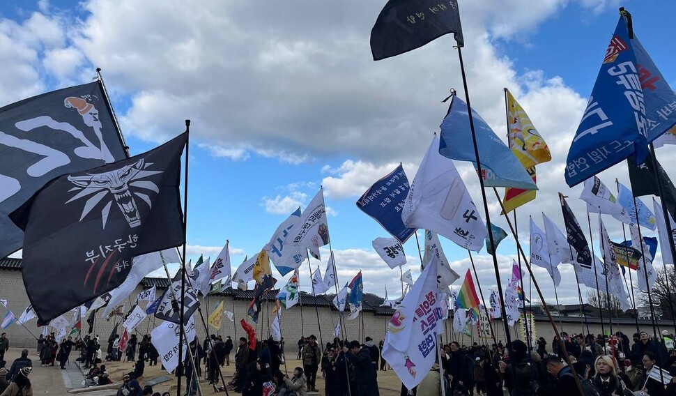 ‘전국탕수육찍먹연합’ 깃발을 든 이기호씨는 “박근혜 전 대통령 때는 파면되리라는 확실한 믿음이 있었는데 지금은 너무 불안하다. 긴장을 늦출 수 없다”면서도 “당시보다 훨씬 심각하고 위험한 내란 행위를 저지른 만큼 합당한 처벌을 받고, 헌법재판소에서도 탄핵이 인용될 거라고 믿는다”고 말했다.
