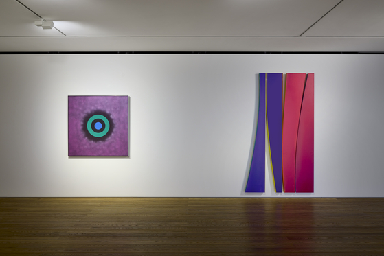 케네스 놀랜드의 ‘미스터리스, 님부스’(2001·왼쪽)와 플랙시글라스에 아크릴을 칠한 ‘불꽃들, 굽이’(1990). 1950년대 동심원 그림으로 데뷔한 그는 색과 색의 긴장감을 담는 데 주력, 직사각 캔버스를 벗어났다. [사진 페이스갤러리] |