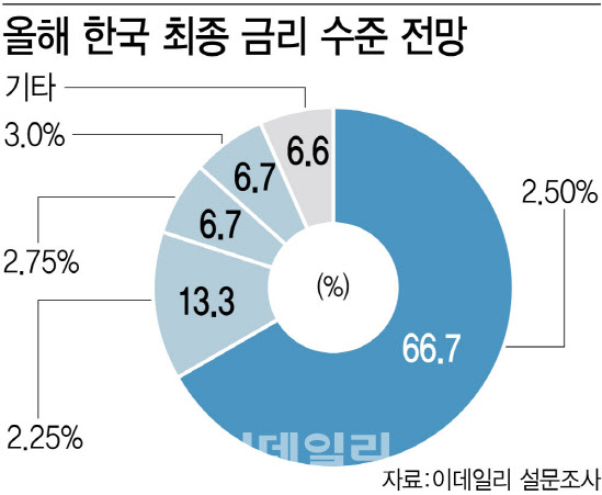 2일 이데일리가 국내 연기금·공제회 등 주요 기관투자자 최고투자책임자(CIO)및 투자전략책임자 15명을 대상으로 설문조사를 진행한 결과 올해 최종 금리 수준으로는 66.7%(10명)가 2.50%를 꼽았다. 현재 한국은행 기준금리는 3.00%로, 올해 안에 최소한 두 번의 금리 인하가 추가로 단행될 것이라고 시장에서는 보고 있는 것이다.