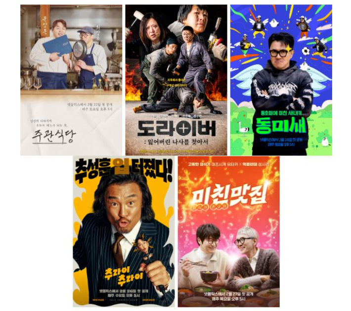 넷플릭스는 3일 "새롭게 서비스되는 작품들은 토크쇼, 캐릭터 버라이어티, 동호회 탐구, 미식 여행 등 다채로운 장르와 소재로 총 5편"이라며 "정해진 회차 없이 매주 새로운 구성과 게스트로 1년 내내 신선한 즐거움을 더할 것으로 기대된다"고 밝혔다.