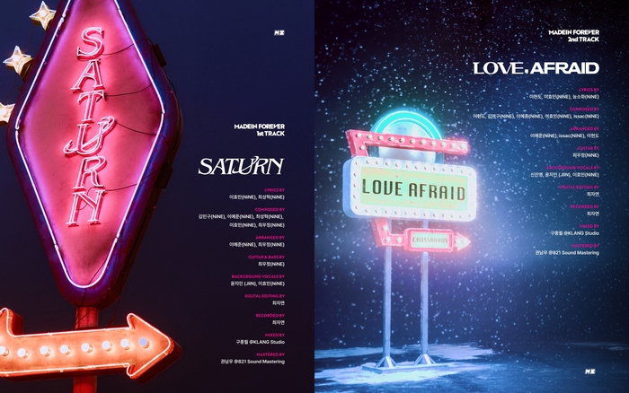 공개된 트랙리스트에 따르면 이번 신보에는 더블 타이틀 ‘SATURN(새턴)’과 ‘사랑, 두려움’까지 총 두 개의 트랙이 수록된다. 메이딘은 서로 다른 분위기의 두 곡으로 다채로운 역량을 증명해 내며 K팝 팬들의 귓가를 사로잡을 전망이다.
