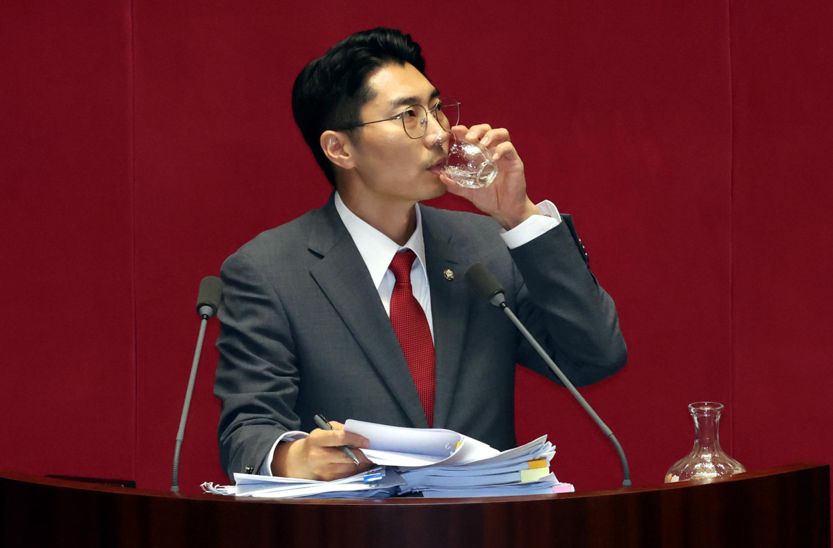 박준태 국민의힘 의원이 4일 오전 서울 여의도 국회에서 열린 제415회 국회(임시회) 제5차 본회의에서 '채해병 특검법' 관련 필리버스터(무제한 토론) 를 하던 중 물을 마시고 있다. 2024.07.04. |