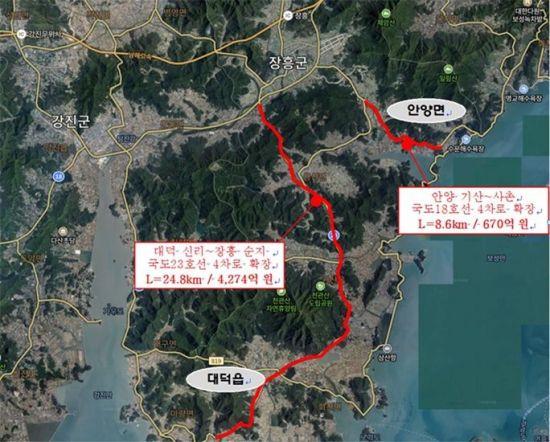 이번에 선정된 사업은 ▲국도 23호선 대덕 신리∼장흥 순지 24.8㎞ 구간(4,274억원) 4차로 확장사업과 ▲국도 18호선 안양 기산∼사촌 8.6㎞ 구간(670억 원) 4차로 확장사업이다.