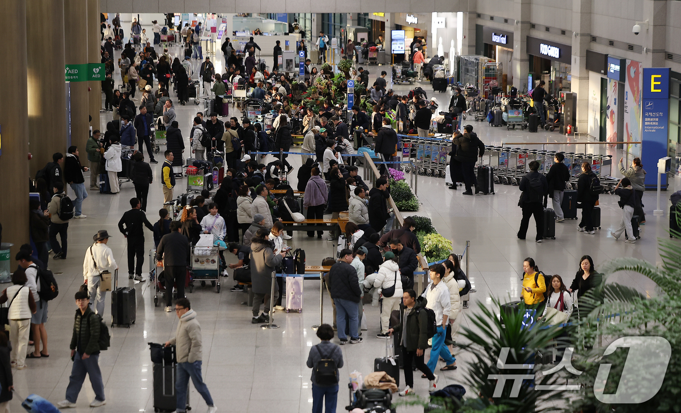 '최장 9일 연휴' 마지막날인 2일 오전 인천국제공항 제1여객터미널 입국장이 귀경객과 여행객으로 북적이고 있다. 인천국제공항공사에 따르면 지난 24일부터 다음 달 2일까지 인천공항을 오갈 여객은 총 214만1000명으로 전망됐다. 일평균 기준 21만4000명이 공항을 이용하는 셈으로 지난해 설 연휴 때의 19만명 대비 12.8% 늘어난 수치다. 2025.2.2/뉴스1 ⓒ News1 김진환 기자 |