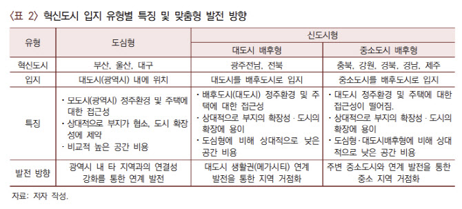 보고서는 10개 혁신도시를 도심형(부산·울산·대구)과 대도시 배후 신도시형(광주전남·전북), 중소도시 배후 신도시형(충북·강원·경북·경남·제주)로 구분하고 각각의 성과를 분석했다. 이 결과 도심형은 정주 여건이 좋아 지식기반산업이 모이기에는 좋으나 기업 단위의 고용·생산성은 정체한 반면, 중소도시 배후형 혁신도시는 넓은 공간과 낮은 비용 부담을 강점으로 교역산업 중심으로 집적이 잘 되고 고용·생산성도 향상되지만, 정주 환경이 발목을 잡고 있었다. 이들의 중간 격인 대도시 배후형 혁신도시는 대체로 위 두 형태의 장점이 함께 나타나며 지식기반산업과 교역산업 모두 유의미한 변화가 있는 것으로 나타났다.