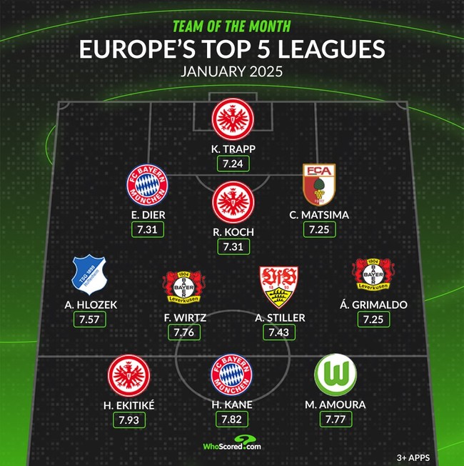 축구 통계 매체 '후스코어드'는 4일(이하 한국시간) 공식 SNS를 통해 분데스리가 1월 이달의 팀을 공개했다. 3-4-3 포메이션이었고, 바이에른 뮌헨 소속으로는 두 명의 선수가 포함됐다. 최전방에 해리 케인이 7.82점의 평점을 받았고, 수비진에는 에릭 다이어가 7.31점의 평점을 받으면서 이름을 올렸다.