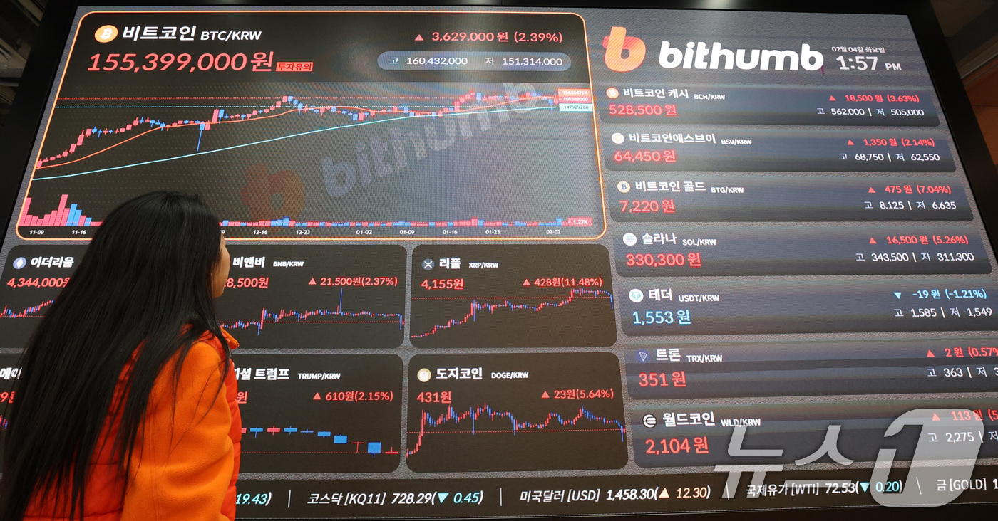 (서울=뉴스1) 박세연 기자 = 4일 오후 서울 서초구 빗썸라운지 전광판에 비트코인 등 가상자산 시세가 표시되고 있다. 트럼프 정부의 ‘관세폭탄’에 급락했던 비트코인은 이날 미국이 멕시코에 이어 캐나다에 대한 관세 부과 시행을 한달 간 유예하면서 다시 10만 달러대를 회복했다. 2025.2.4/뉴스1