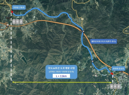 장수군 천천면과 진안군 진안읍을 연결하는 국도26호선은 현재 급커브와 급경사 등 선형 불량 구간이 많아 안전성이 크게 떨어지는 2차선 도로로 수십년간 개선을 요구하는 목소리가 높았다.