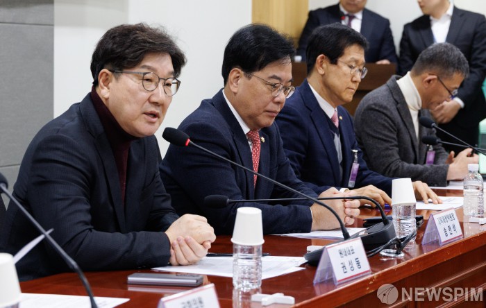 [서울=뉴스핌] 윤창빈 기자 = 권성동 국민의힘 원내대표가 5일 오전 서울 여의도 국회 의원회관에서 송언석 국회 기획재정위원장 주재로 열린 대한민국 경제 재도약을 위한 정책토론회 1탄 건설 산업 경청회에서 인사말을 하고 있다. 2025.02.05 pangbin@newspim.com