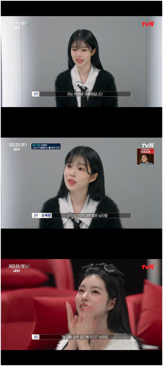 한편 모델 유혜원은 역대급 미모로 모든 참가자의 시선을 쓸어모았다. 그는 조심스럽게 굴었으며, 그러면서도 결혼에 대한 꿈이 있다고 밝혔다.