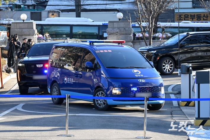 윤석열 대통령이 탑승한 호송차가 6일 탄핵 심판 6차 변론기일이 열리는 서울 종로구 헌법재판소로 들어오고 있다.