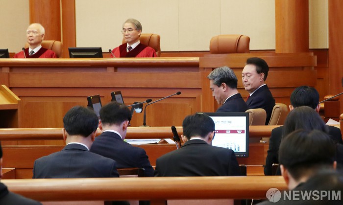 [서울=뉴스핌] 사진공동취재단 = 6일 서울 종로구 헌법재판소 대심판정에서 윤석열 대통령 탄핵심판 6차 변론기일이 열리고 있다. 2024.02.06 photo@newspim.com