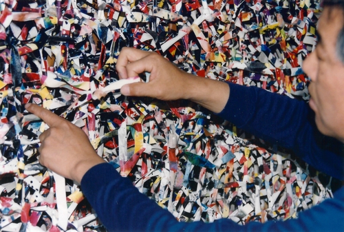 (서울=연합뉴스) 황희경 기자 = 색점과 색선, 얼룩 등으로 추상회화를 그린 뒤 캔버스를 뒤집어 일정한 간격으로 선을 긋고 가위로 잘라낸다. 잘린 색띠를 틀이나 지지체에 묶어 그물망을 만들면 신성희(1948∼2009) 작가의 '누아주' 회화 (엮음회화)가 완성된다. 또 색칠한 캔버스를 일정한 폭으로 재단하고 바느질이나 재봉틀로 박음질해 솔기가 드러나게 이으면 '꾸띠아주' 회화(박음회화)가 만들어진다.