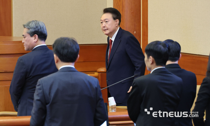 윤석열 대통령이 6일 서울 종로구 헌법재판소 대심판정에서 열린 탄핵 심판 6차 변론에 출석해 착석하고 있다.