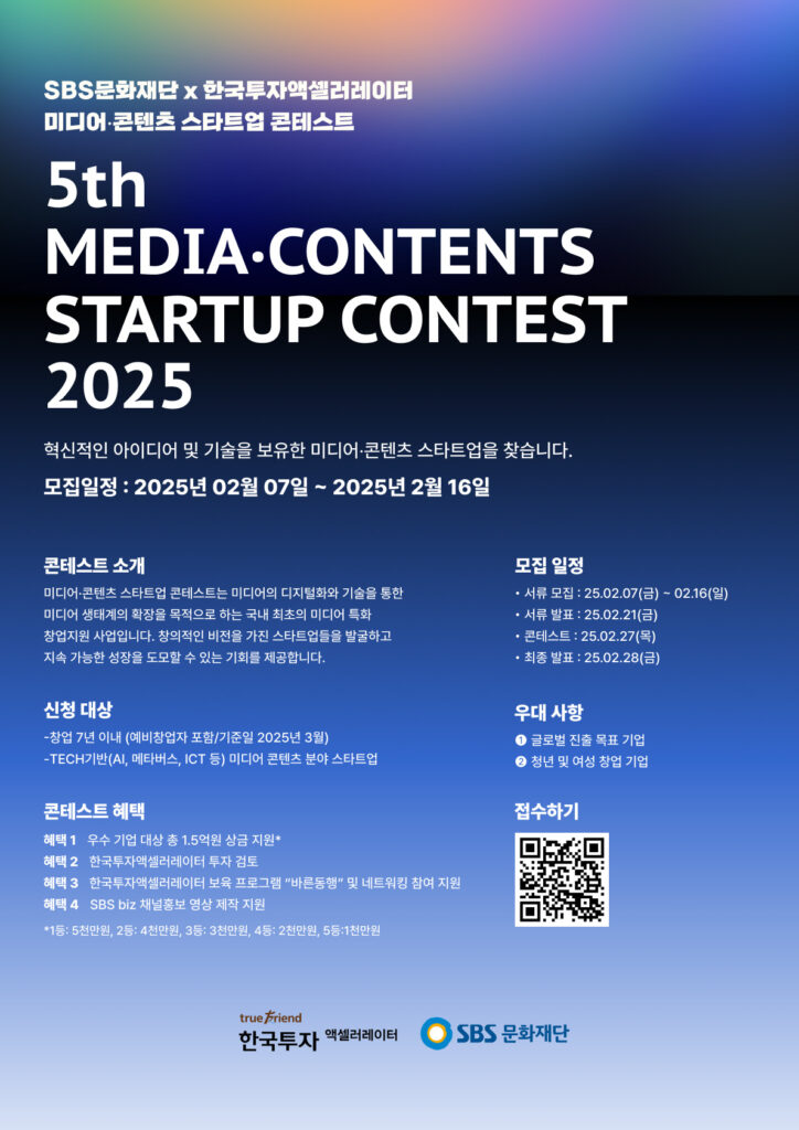 SBS문화재단과 한국투자액셀러레이터(이하 한투AC)가 미디어·콘텐츠 분야의 유망 스타트업을 발굴하기 위한 대규모 콘테스트를 개최한다. 6일 양 기관은 '2025 SBS x KIAC 미디어·콘텐츠 스타트업 콘테스트' 5기 모집을 7일부터 시작한다고 발표했다.