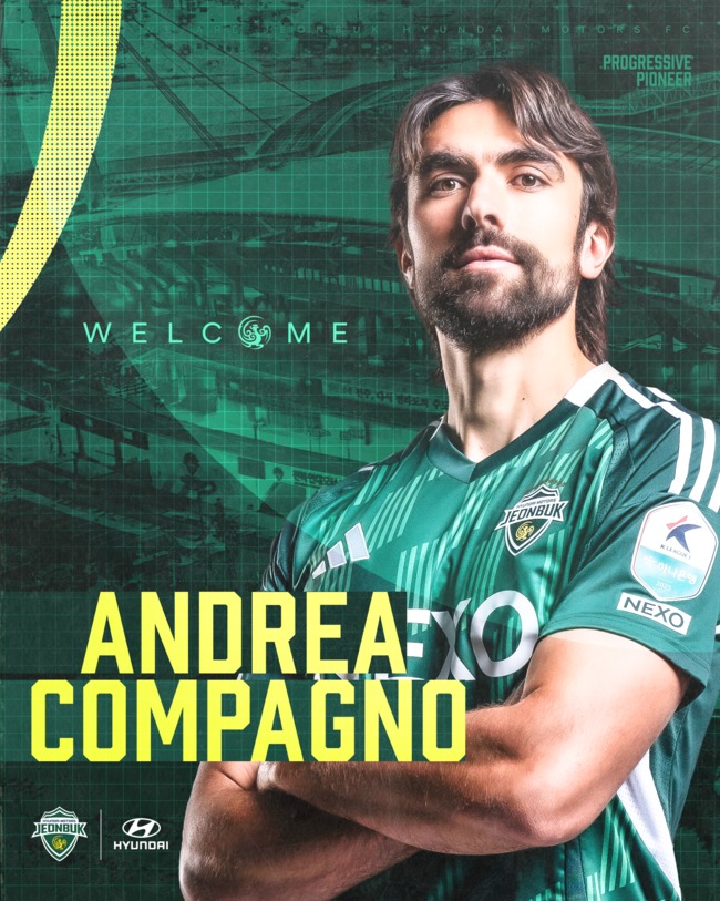 전북현대는 6일 이탈리아 출신으로 국가대표 발탁 경력까지 갖춘 최전방 공격수 안드레아 콤파뇨(Andrea Compagno/28세/FW/195cm/80kg)를 FA영입 했다고 밝혔다.