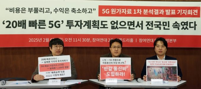 참여연대 민생희망본부 활동가들이 6일 서울 종로구 참여연대에서 5G 원가자료 1차 분석결과 발표 기자회견을 하고 있다./사진=뉴스1 |