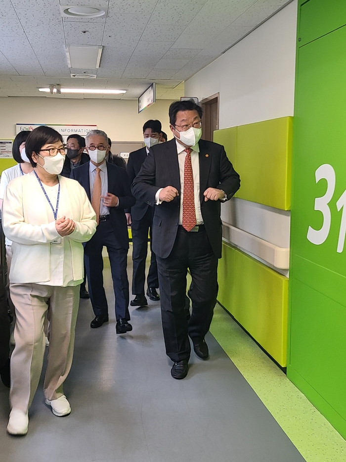 주형환 저출산고령사회위원회 부위원장(오른쪽)이 6일 노인전문병원과 공공요양시설을 둘러보고 있다. |