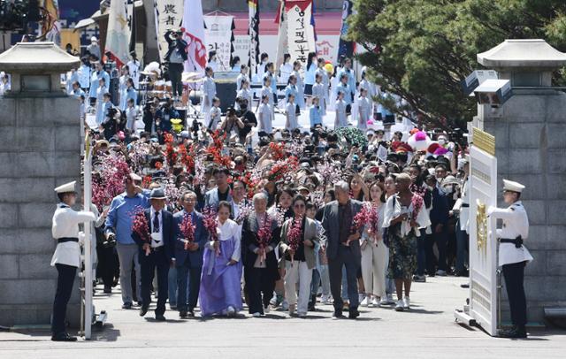 윤석열 대통령이 취임한 2022년 5월 10일 열린 청와대 개방 행사에서 국민 대표 74명이 꽃가지를 들고 입장하고 있다. 뉴시스 |